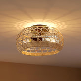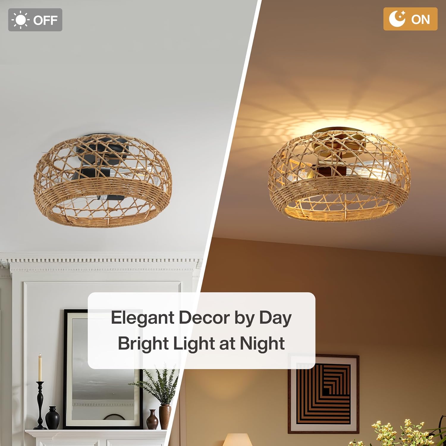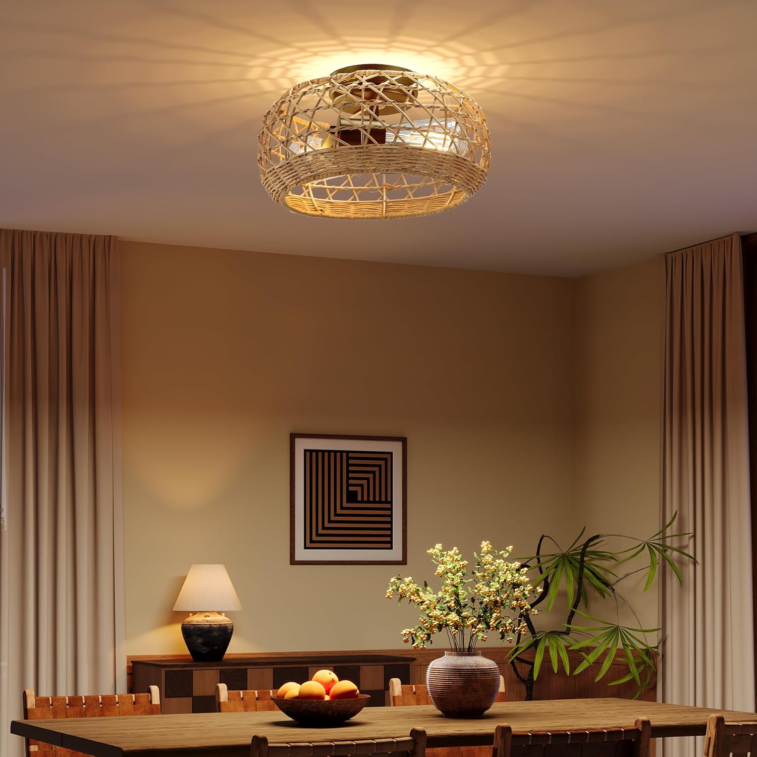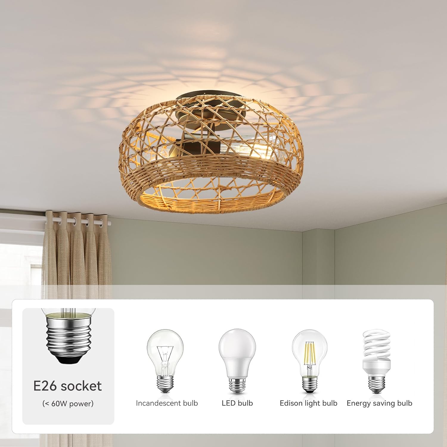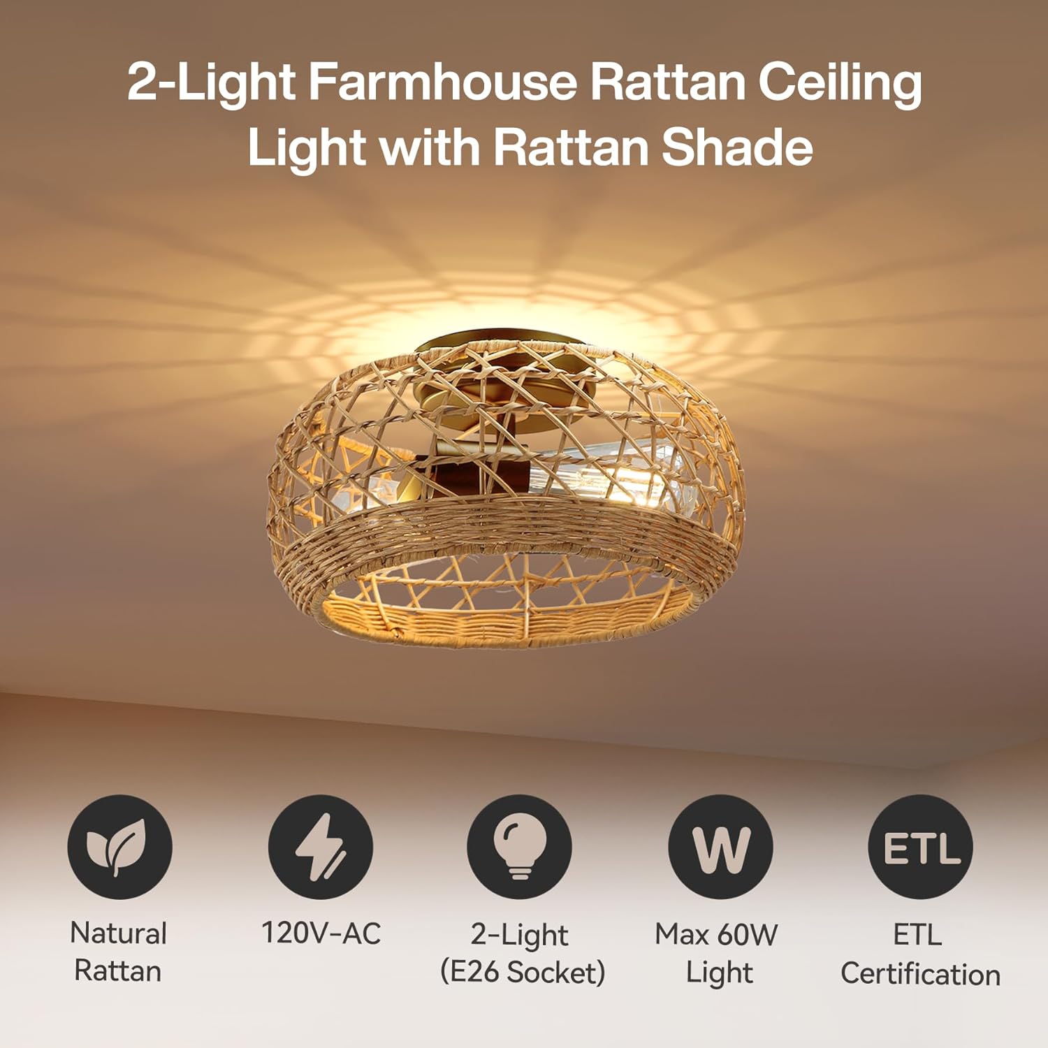 11.8" Boho Flush Mount Light Fixture, Rattan Ceiling Light Cage Shade Flush Lamp