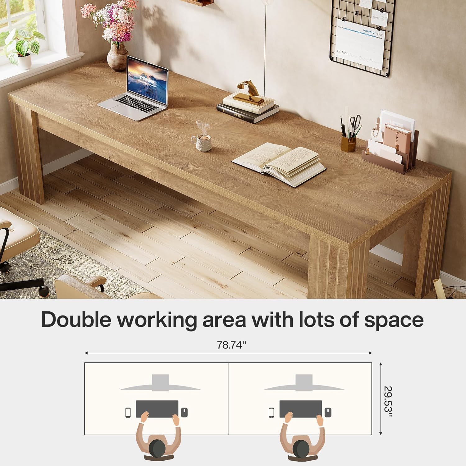 Ample Workspace - Sized at 78.74" in length, 27.56" in width, and 29.53" in height, this extra-long desk provides generous space for two people to operate comfortably side by side. Designed for remote work setups, it accommodates dual monitors, laptops, and office supplies efficiently.