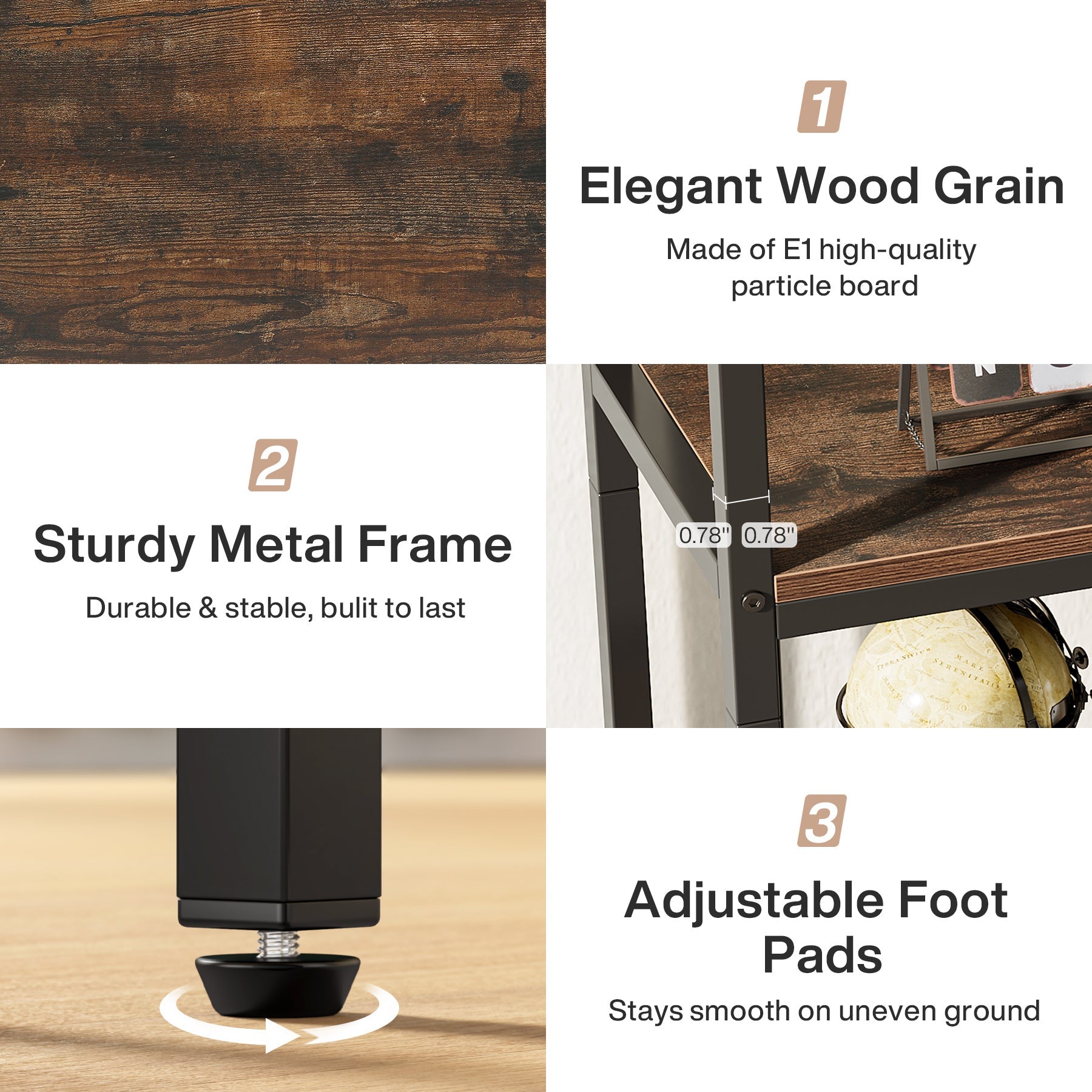 Durable & Stable - Crafted from premium particleboard and sturdy steel, our bookshelf can carry up to 330 lbs. Four adjustable pads ensure stability, even on uneven surfaces, and the surface is easy to clean.