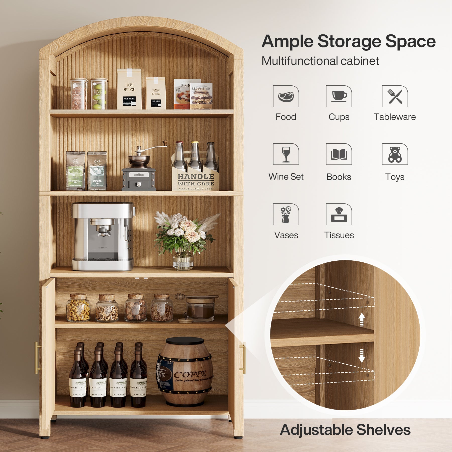 Arched Kitchen Pantry Cabinet, 5-Tier Storage Cabinet with Open Shelves