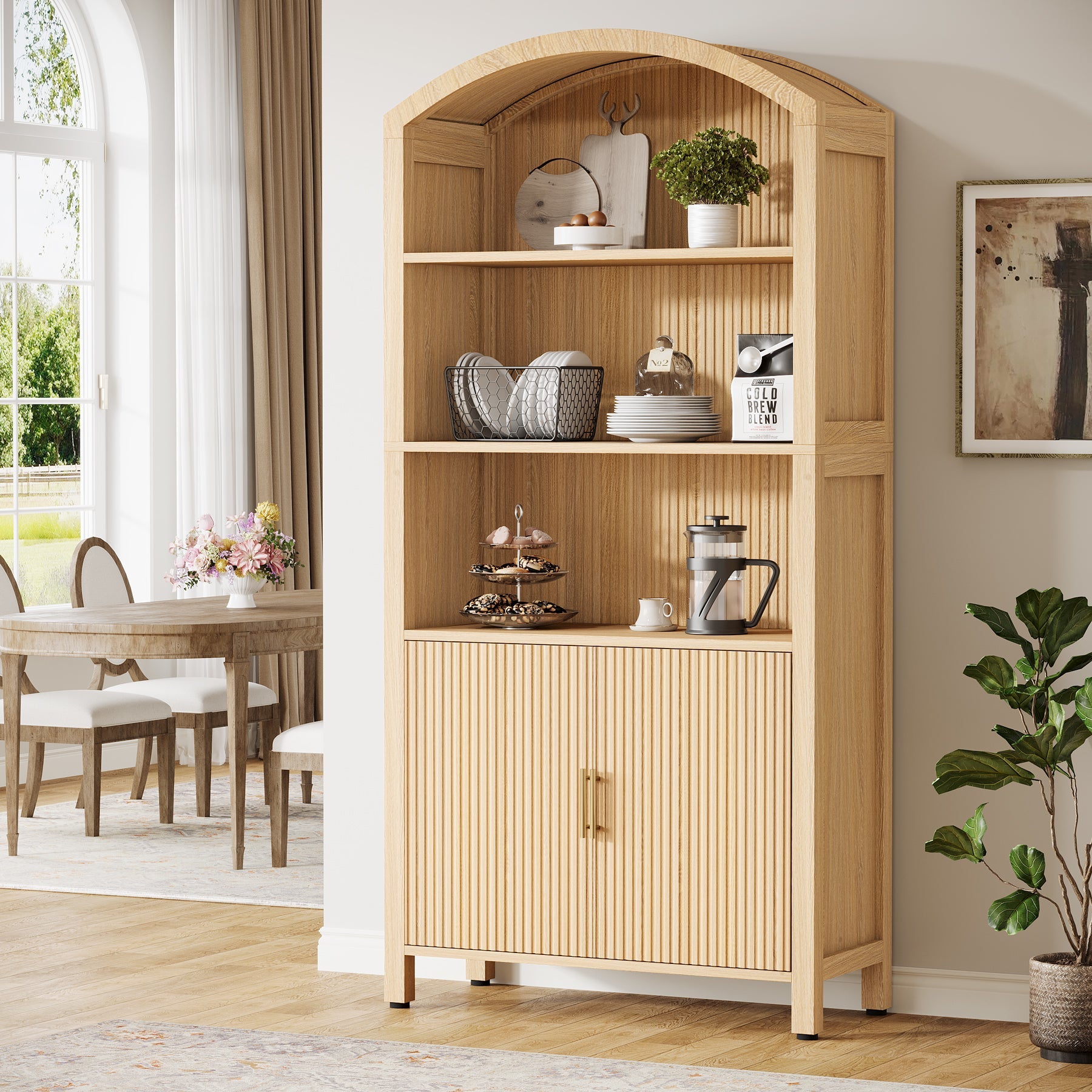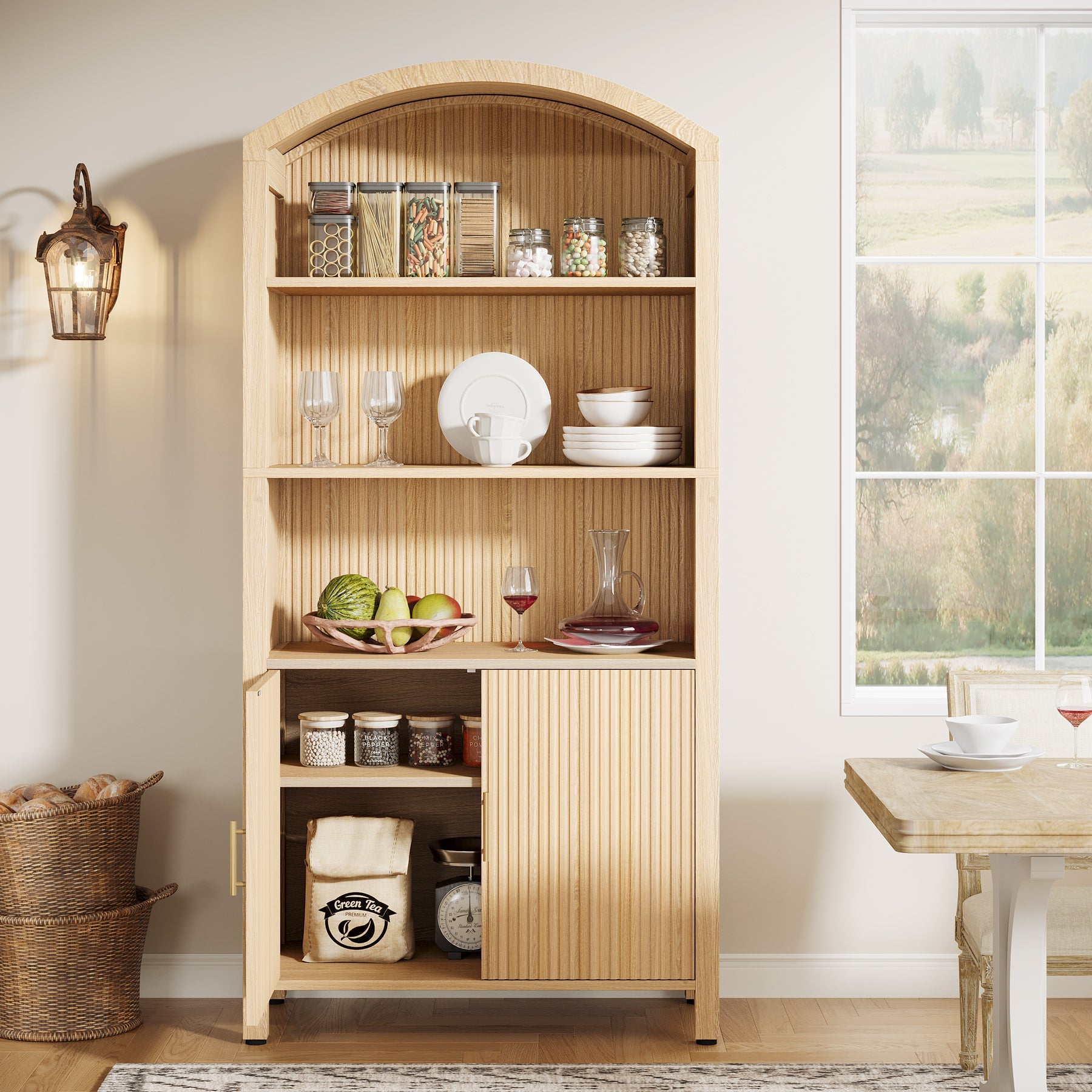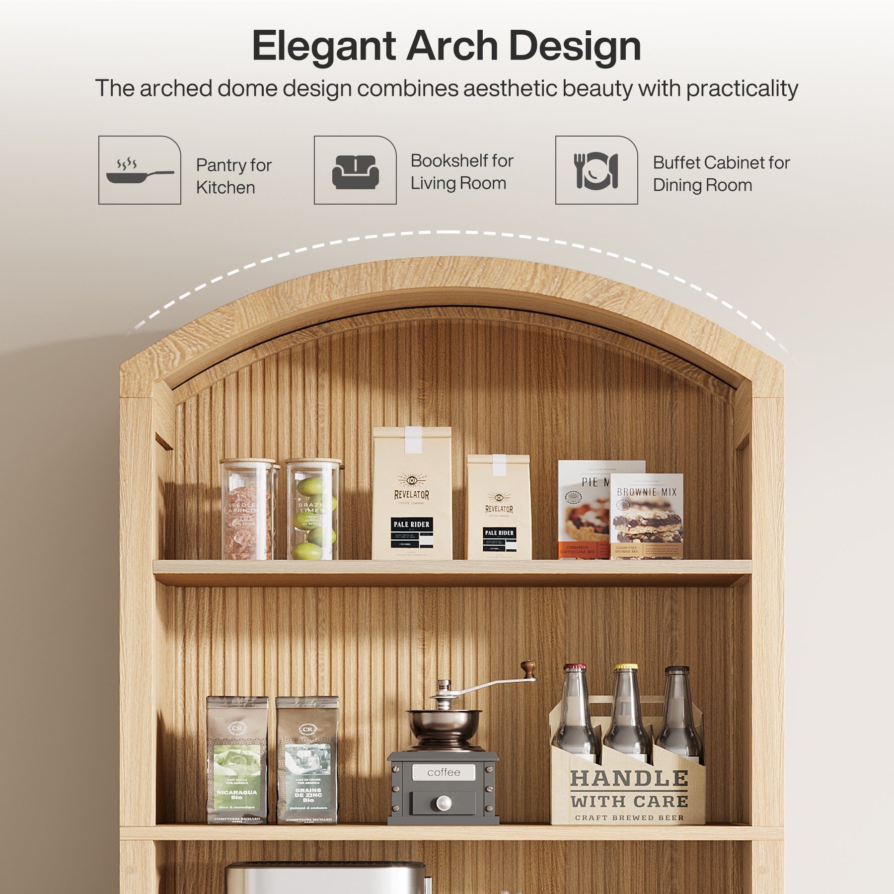 Sleek Mid-Century Modern Pantry Cabinet - This stylish kitchen storage piece features a natural wood grain finish and a graceful arched design, making it a perfect match for any kitchen decor. Its timeless look elevates your space while keeping everything organized.