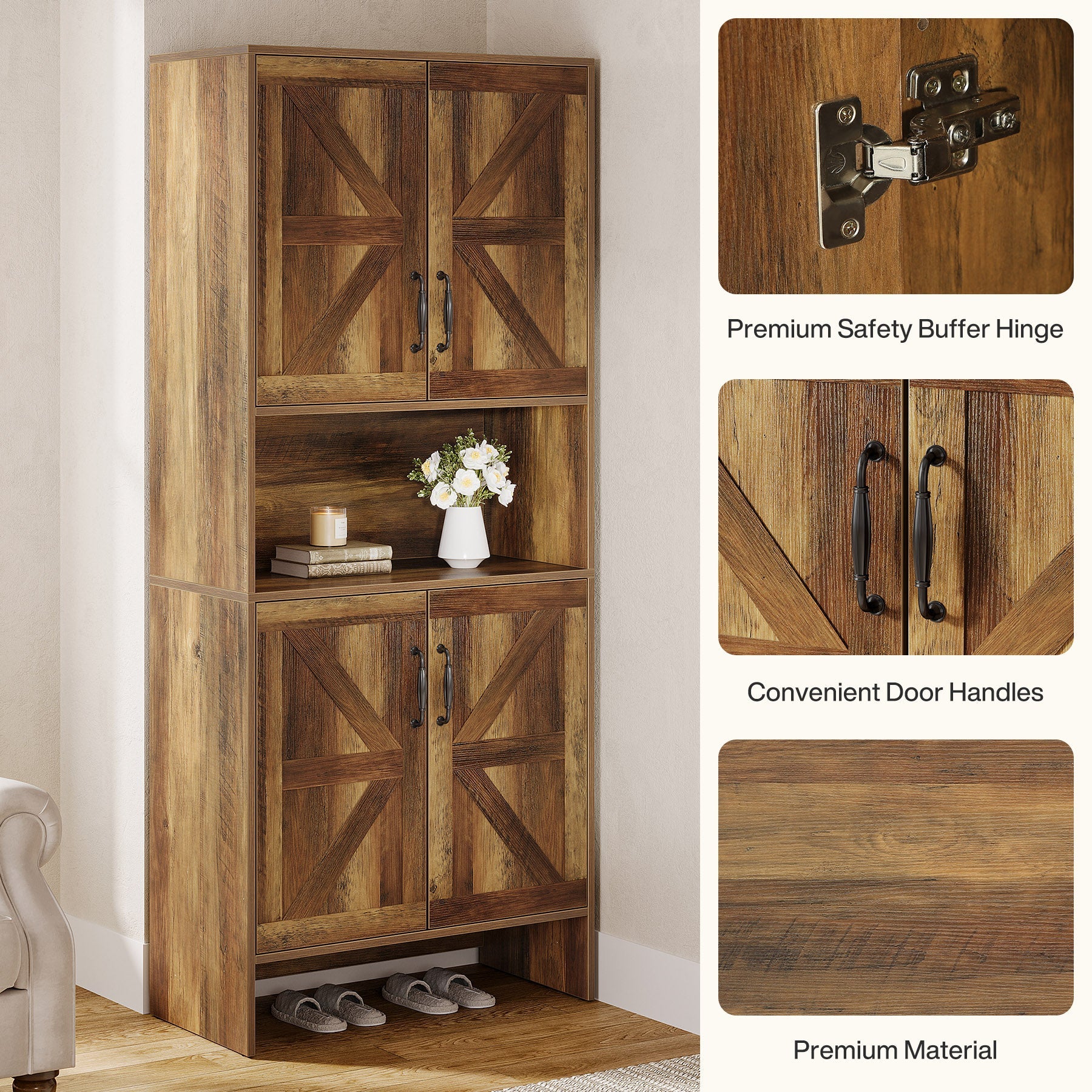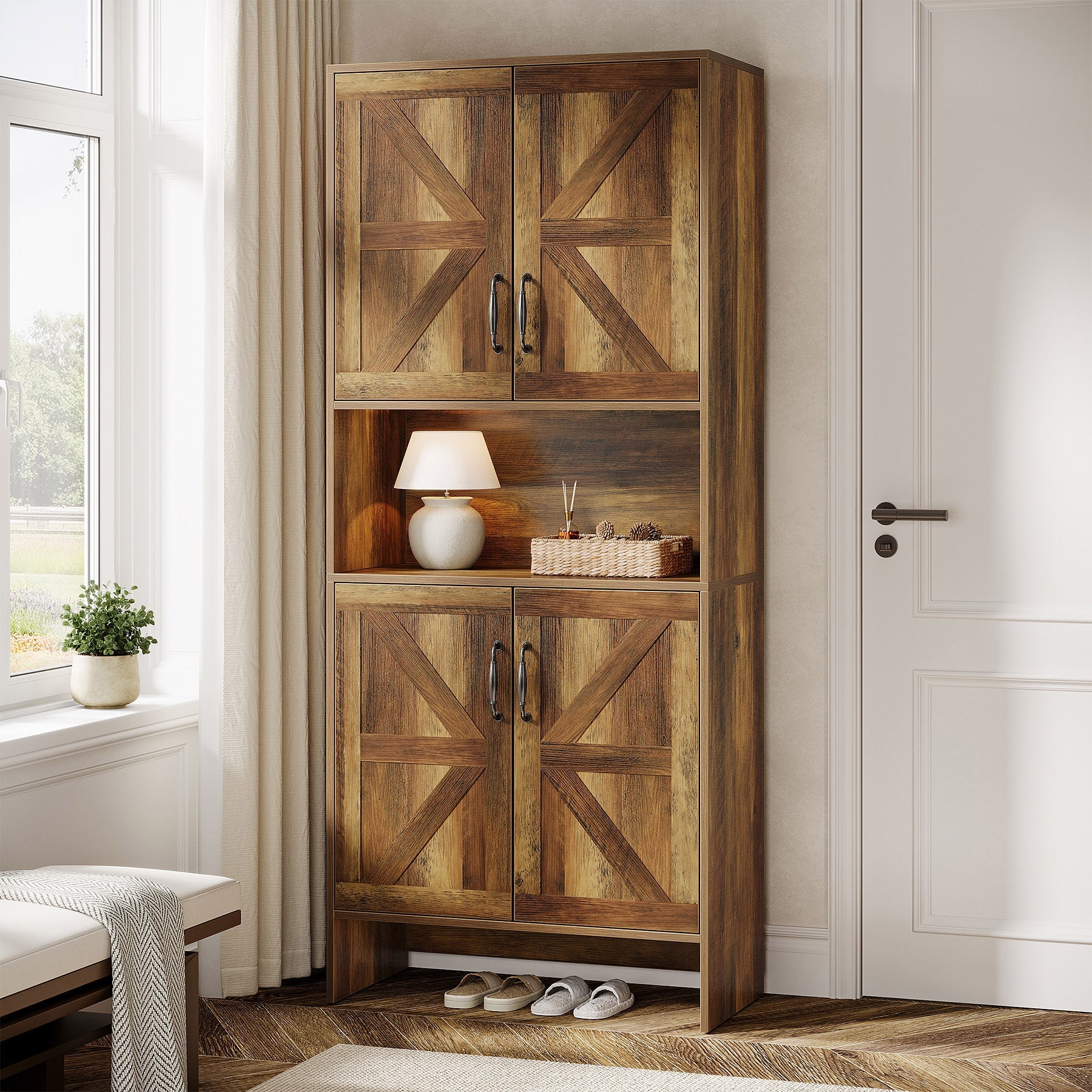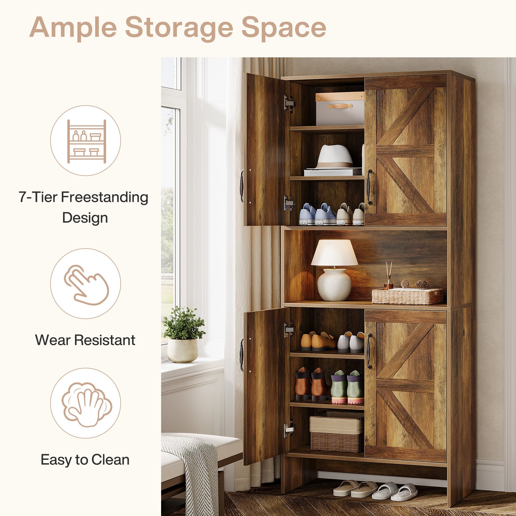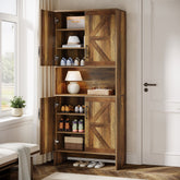 Farmhouse-Inspired Shoe Storage - This versatile 7-tier shoe cabinet features a stylish wood grain finish with vintage metal handles, catering to any home decor. It can hold everything from heels and sneakers to boots.