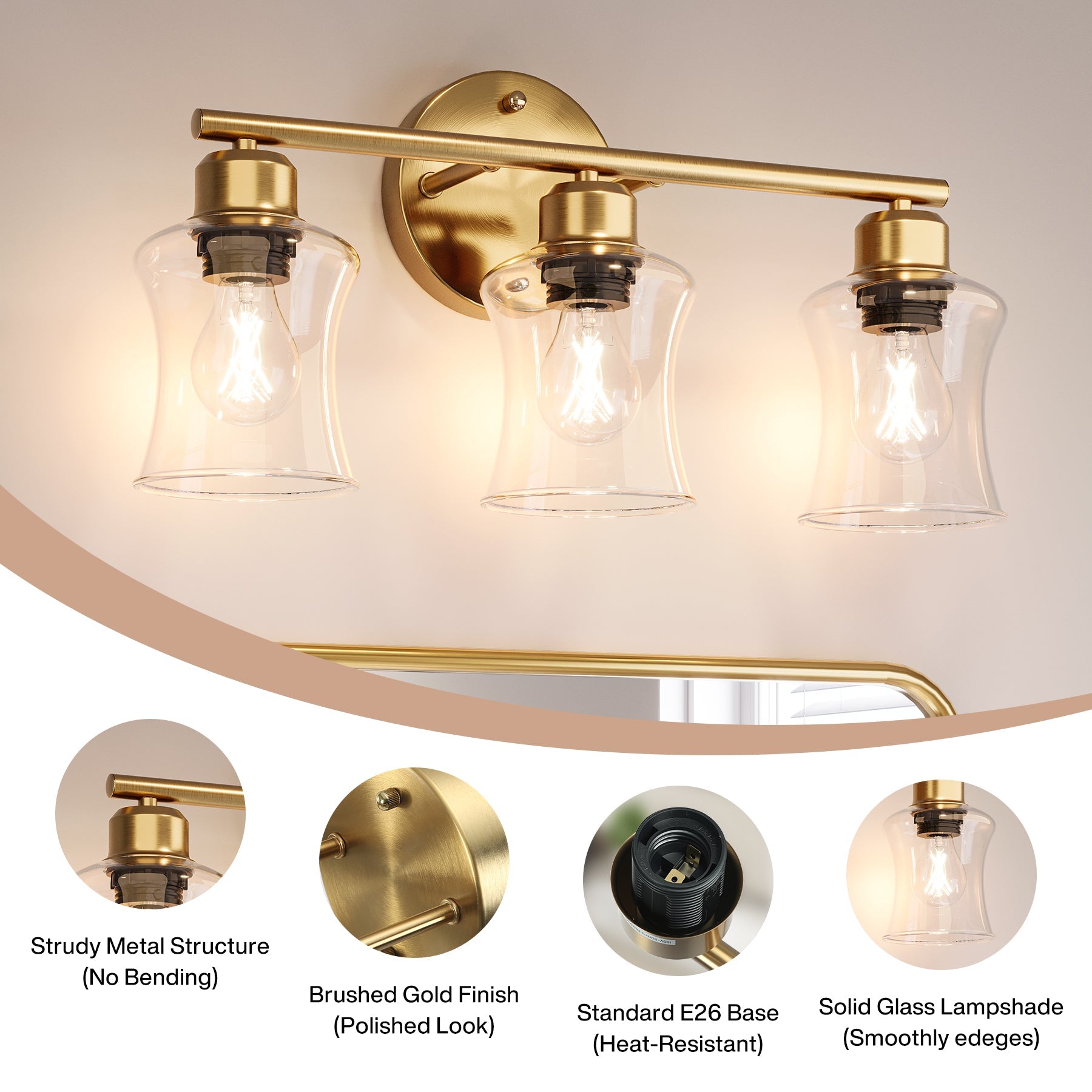 Premium Brushed Gold Finish - These bathroom light fixtures showcase an upgraded brushed gold finish paired with transparent glass lampshades. The refined surface adds elegant style while maintaining its luxurious appearance over time.